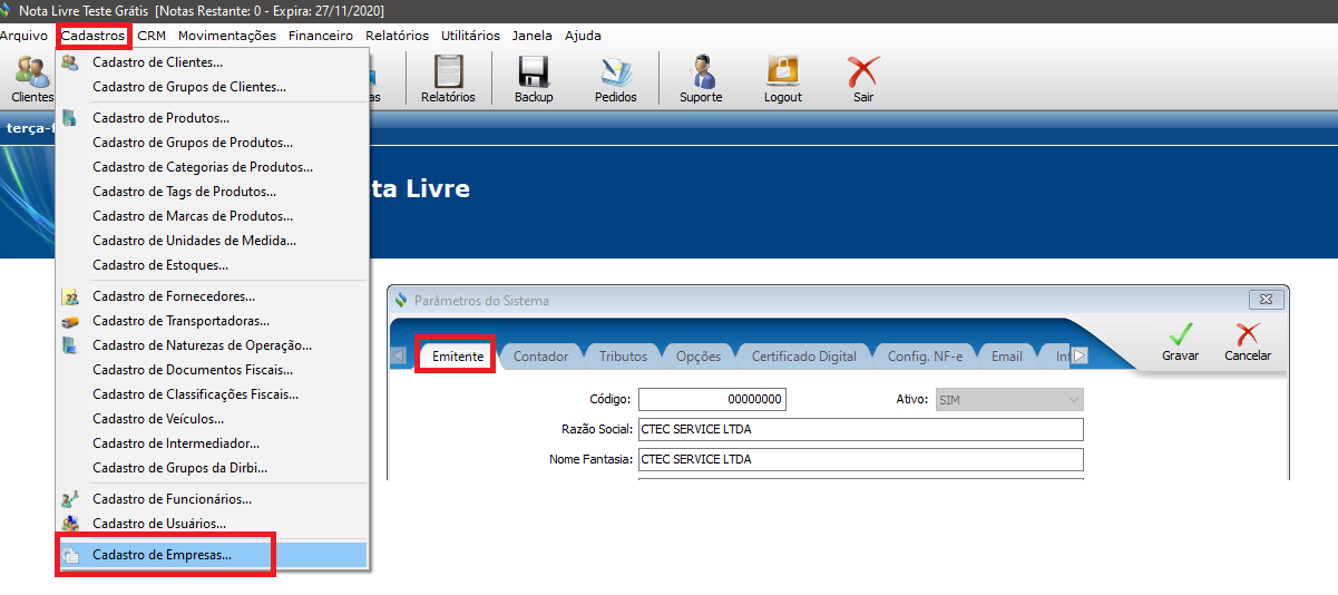 2\. Clique no menu **“Cadastros”** e após em **“Cadastro de Empresas”**;<br>