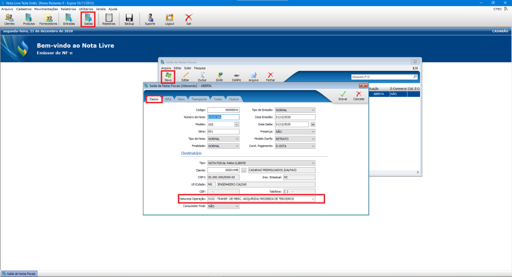 1\. Em **Saída de Notas Fiscais** clique em **Novo** e preencha os **Dados** corretamente, lembramos que seu contador deverá ser consultado para confirmar a tributação, CST e CFOP que serão utilizados;