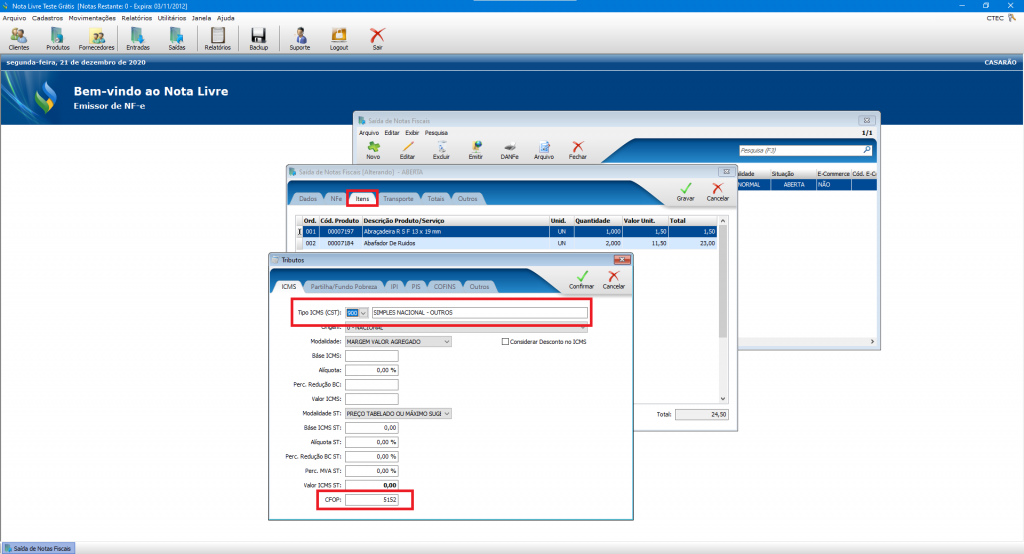 2\. Na guia **Itens** acrescente os produtos corretamente e colocando os **Tributos** conforme informado pelo seu contador;