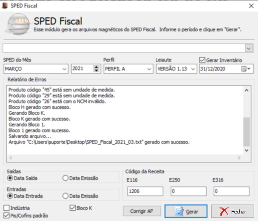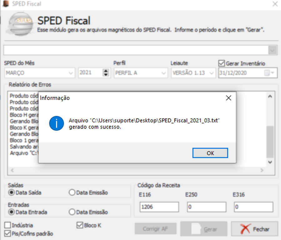 Abrirá uma janela informando se o arquivo foi gerado com sucesso ou não. Se foi gerado com sucesso clique em OK, se foi gerado com erros, será necessário corrigir o erros e gerar novamente. Caso não consiga resolver o erro, entre em contato com o nosso Suporte Técnico.