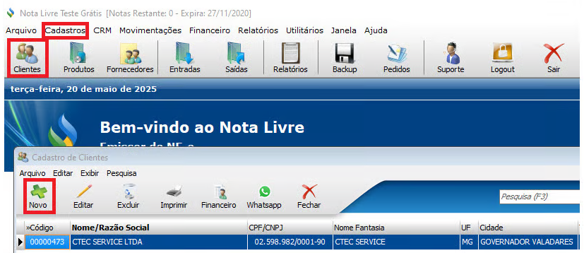 Abra o [Nota Livre](https://notalivre.com.br/download/) e clique em **Clientes**;