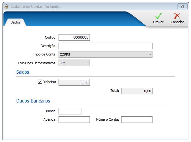 3\. No campo **“Descrição”** inclua o nome da Conta que será cadastrada;<br>