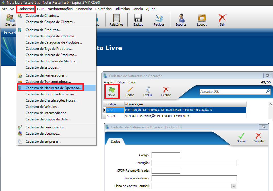 No menu clique na opção **“Cadastro”** e após em **“Cadastro de Natureza de Operação”;**