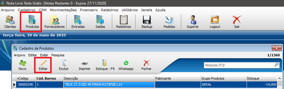 Abra o sistema [Nota Livre](http://www.notalivre.com.br/) e clique na opção **Produtos** para abrir a tela;