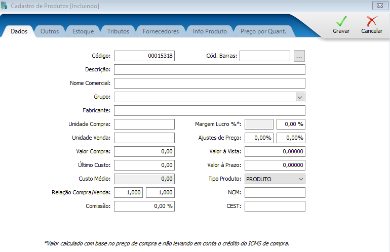 *Caso o produto utilize tributação padrão, esta deve ser preenchida no Cadastro da Empresa, não sendo necessário preencher dentro do cadastro do produto.*